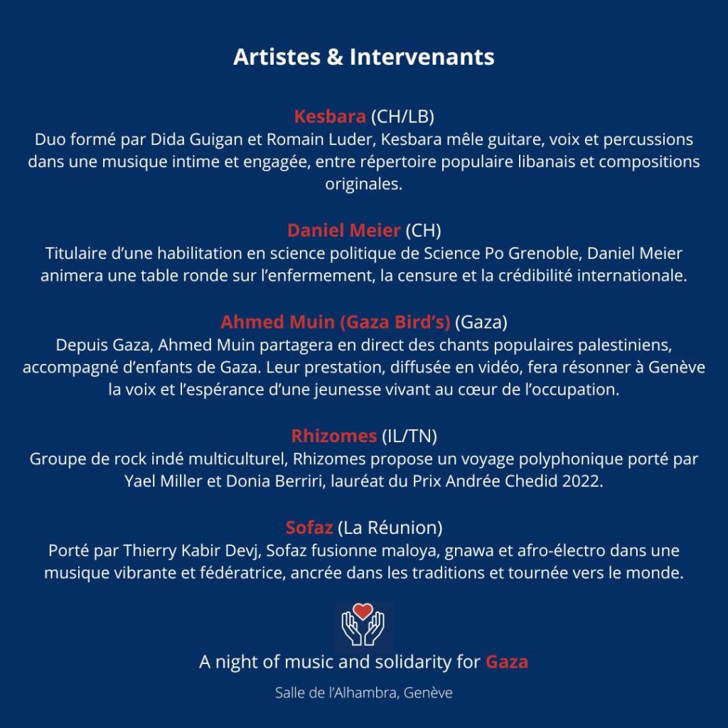 Des voix et des actes pour Gaza Date: 25.10.25 Horaire: Lieu: Alhambra Date : 25 octobre 2025Heure : 6:30 pm - 11:55 pmLieu: AlhambraPlus d'infos